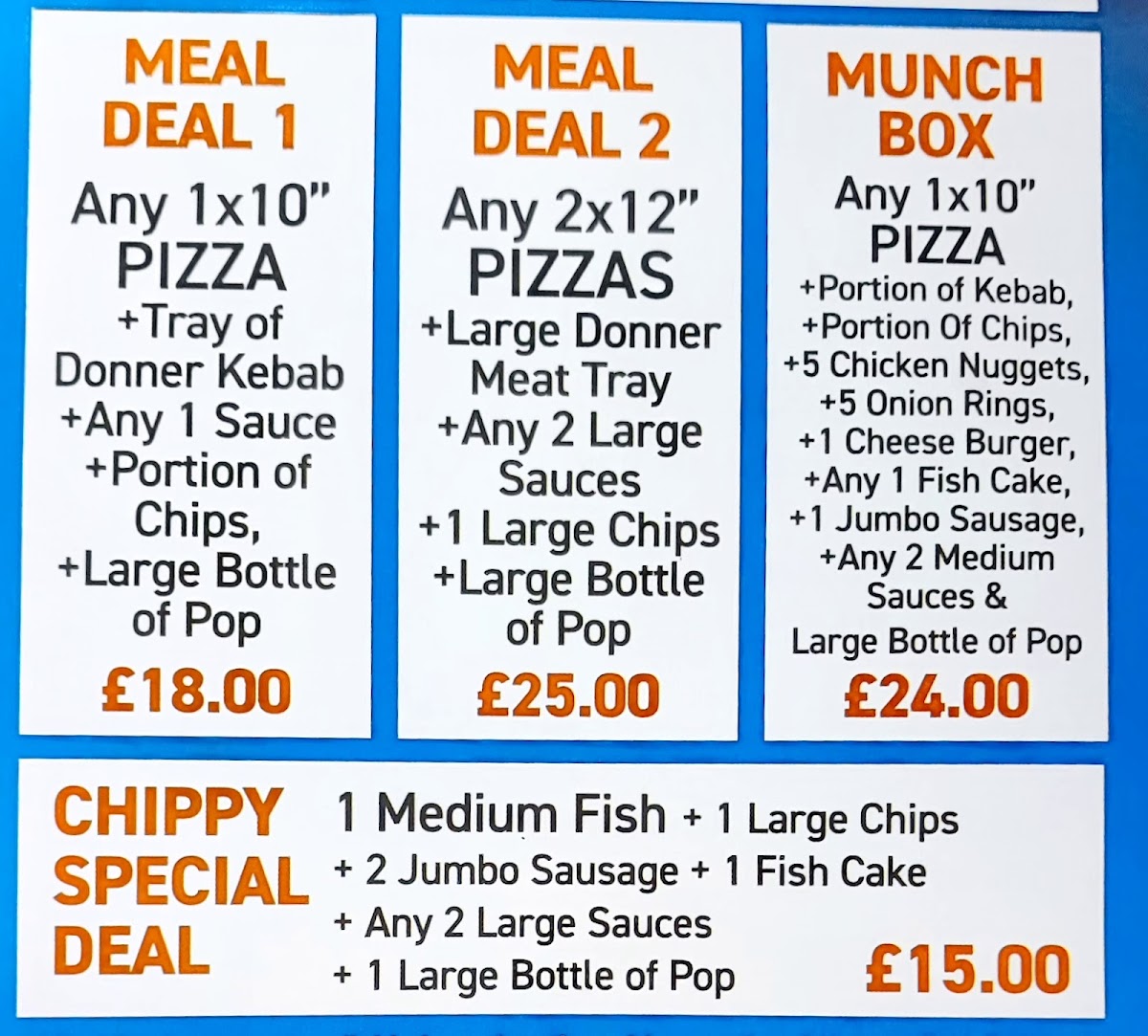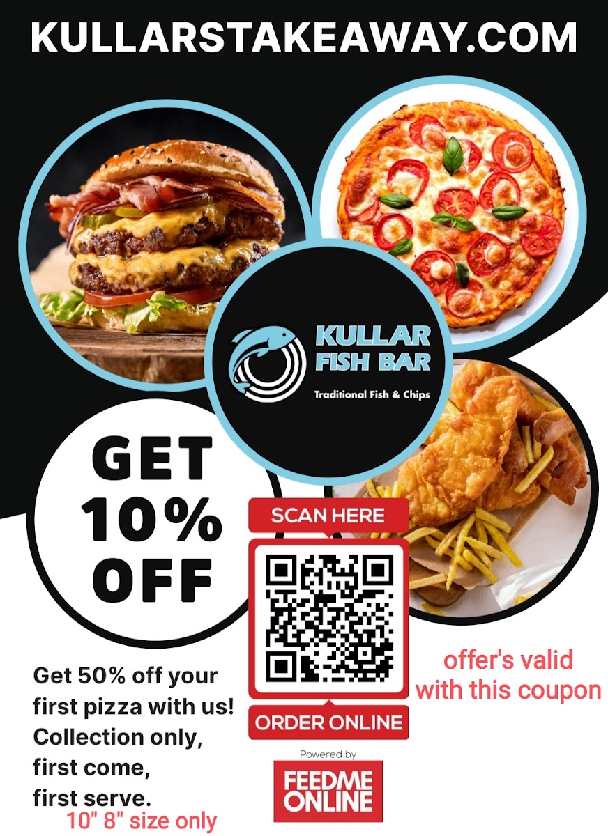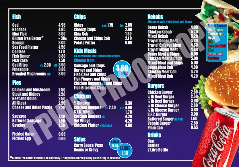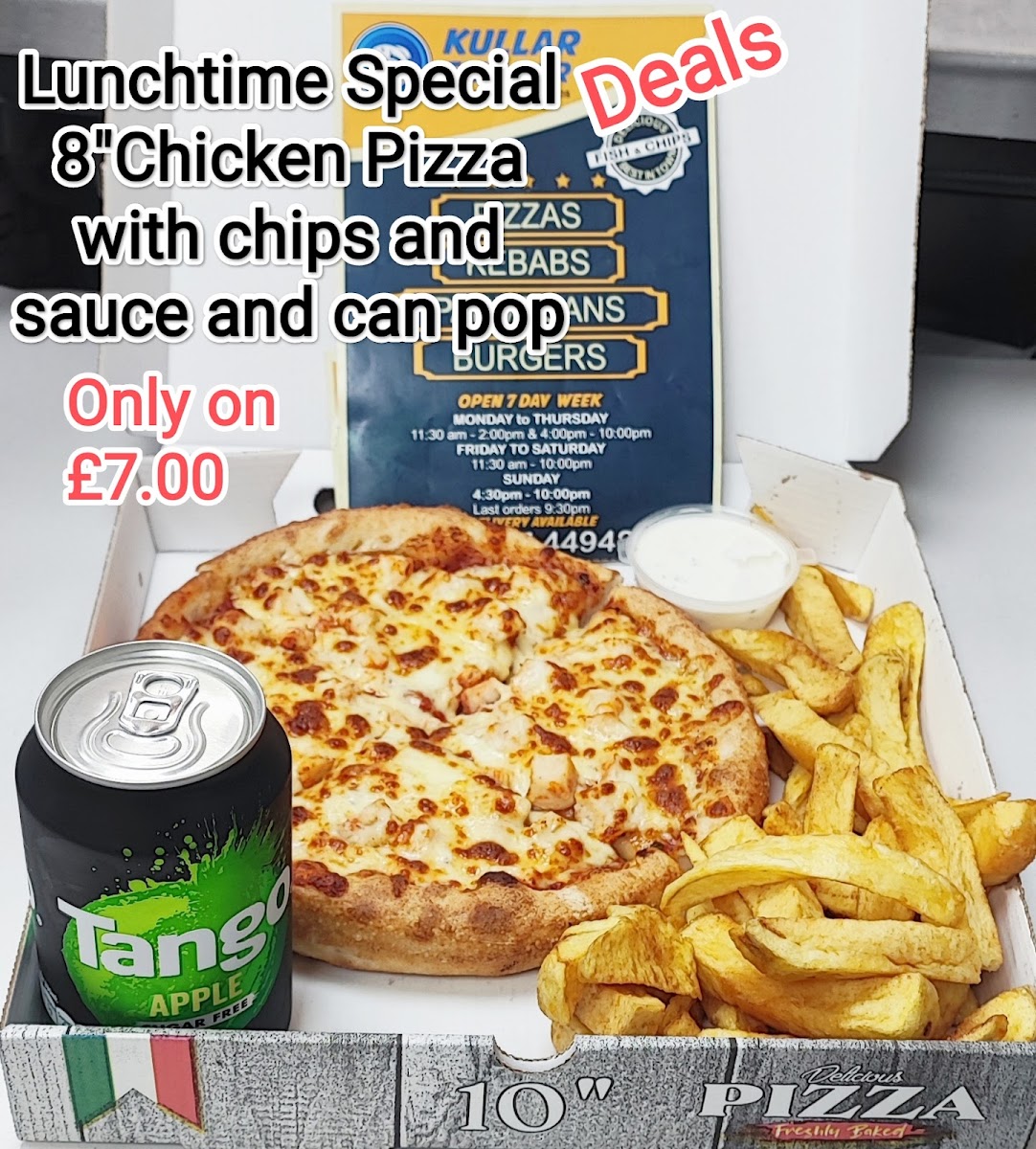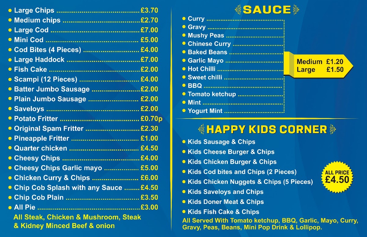 Kullar Fish Bar offers a wide range of delicious options for all tastes, with a menu that caters to various cravings. For fish lovers, there are classic choices like Cod and Haddock, or more exciting options like the Seafood Platter. The chips section features simple favorites such as Chips, Cheesy Chips, and unique items like the Chip Cob or Cheese and Chips Cob. Kebabs are another highlight, with the Doner Kebab and Chicken Kebab, as well as mixed options like the Mixed Kebab and Tray of Doner Meat. For burger enthusiasts, the Chicken Burger and S.F.C. Burger stand out, along with indulgent choices like the ½ Lb Cheese Burger and the Ib Cheese Burger. Chicken dishes are plentiful, offering crispy options like Chicken Nuggets, S.F.C. Fillet, and Hot Wings. Drinks include a variety of cans, bottles, and even 2-litre bottles for those with a bigger thirst. The sides menu includes comforting additions like Curry Sauce, Mushy Peas, and Baked Beans. For the little ones, the Happy Kids Corner provides kid-friendly meals such as Kids Sausage & Chips and Kids Chicken Nuggets & Chips. If you're after something different, there are also simple but satisfying options like Fish Fingers and Chips and Burger and Chips. With a variety of dishes available at reasonable prices, Kullar Fish Bar guarantees something for everyone.